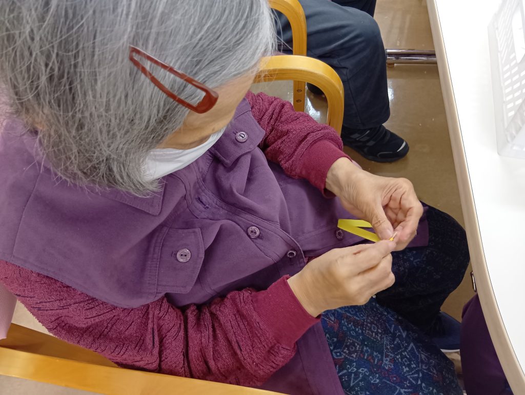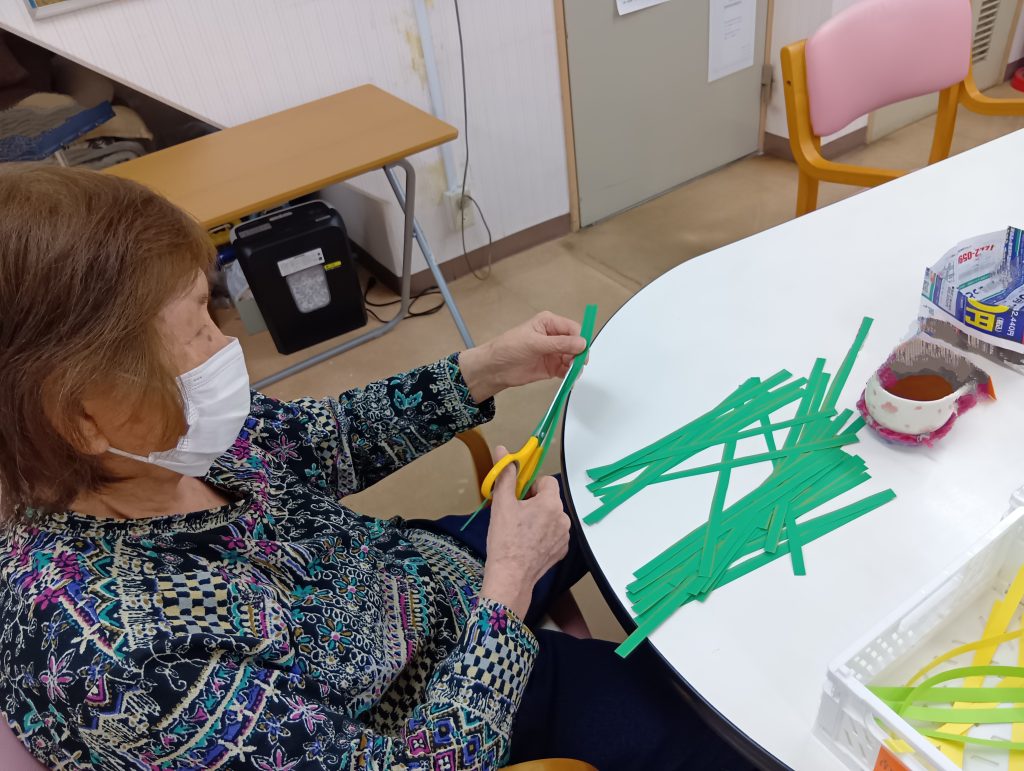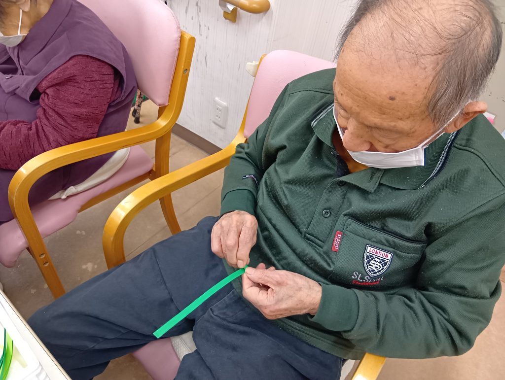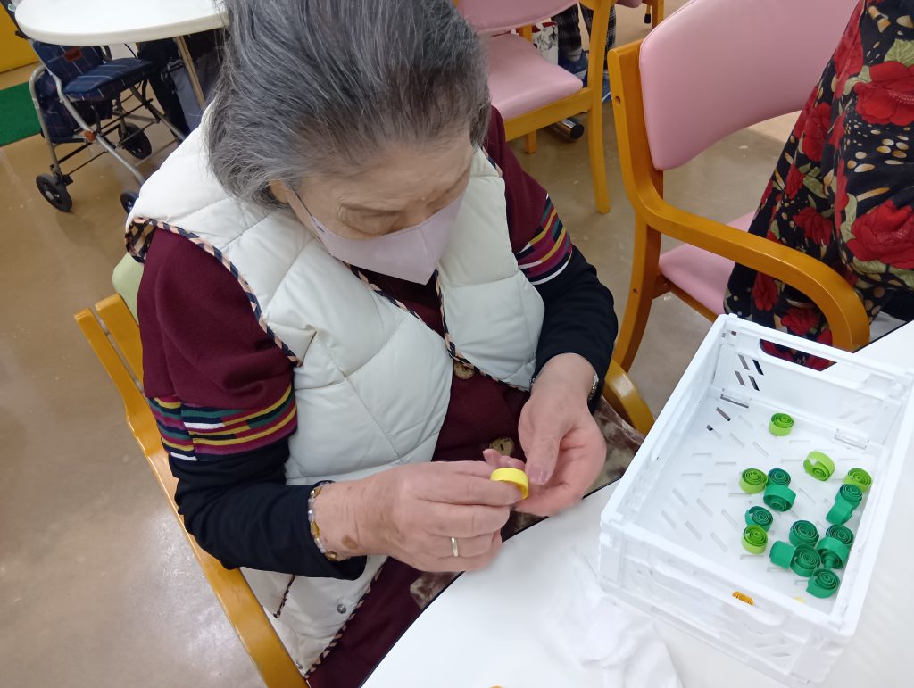 デイケアコスモス デイケアコスモスのブログ 2025.11.12 今月の工作はペーパークイリニングの 「クリスマスツリー」です! 緑色の画用紙を細長く切られていますね 爪楊枝を使ってクルクル巻いています 緑色・黄緑色・黄色 どんどん出来ています♪ お楽しみに~♪