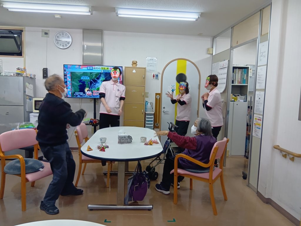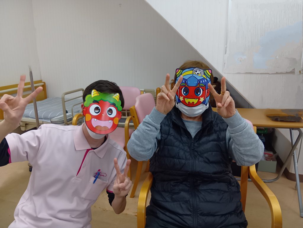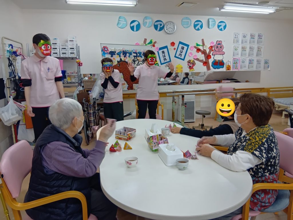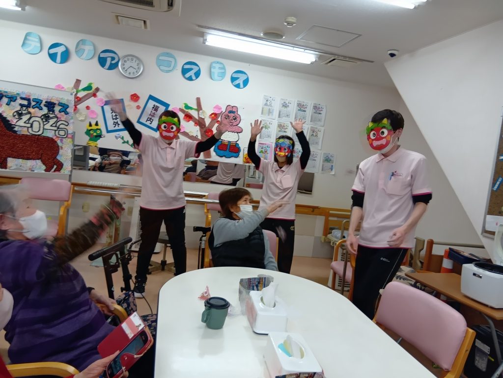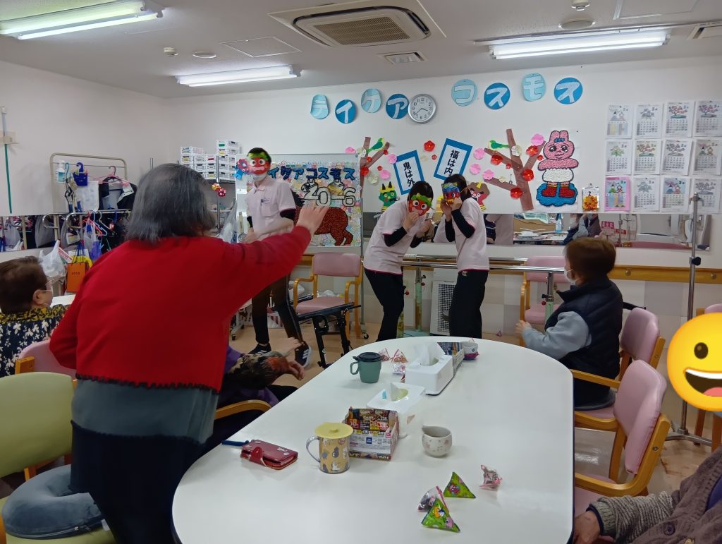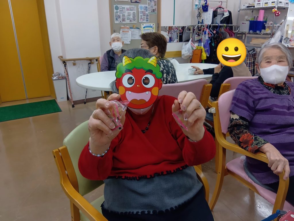 デイケアコスモス デイケアコスモスのブログ 2026.02.05 2月3日「節分の豆まき」の様子です! 「鬼は外~!」 掛け声よりも 投げる方に集中されて 立ち上がって鬼さんを狙う方も笑笑 楽しまれていました♬ 鬼のお面をつけられています♪ かわいい鬼さんですね♪